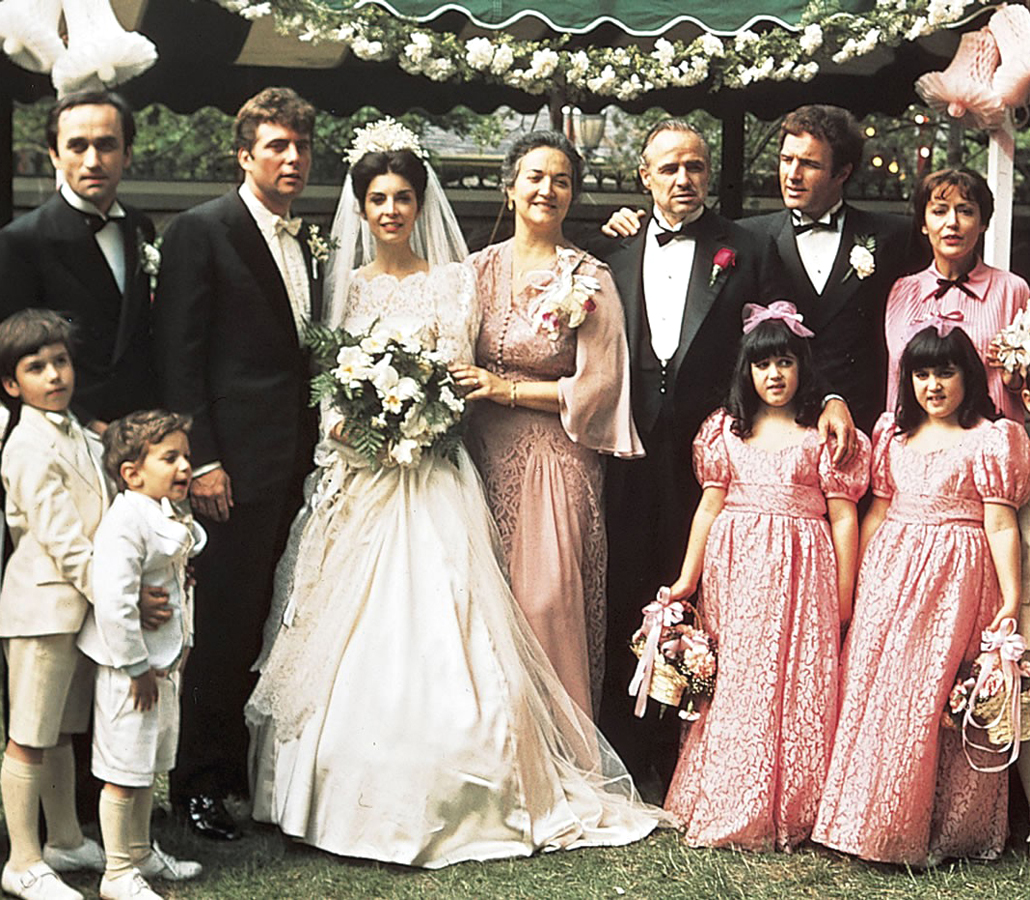 passar da pose de fotografia de família ao plano em que Don Vito conduz a noiva