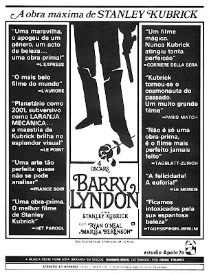 “Barry Lyndon” foi dos filmes mais ansiosamente aguardados de Kubrick, que vinha de nos ofertar duas genuínas obras-primas do Cinema: “A Clockwork Orange”, em 1971 e sobretudo “2001: A Space Odyssey” em 1968. Oito anos e cinco meses, foi o tempo que decorreu entre a estreia em Lisboa (no Monumental, a 1 de Outubro de 1968) deste último filme e o aparecimento do “Barry Lyndon” no estúdio Apolo 70 a 25 de Fevereiro de 1977. Tempo demasiado, quando se pensa que pelo meio até houve uma revolução e que só por causa dela tivemos direito em território nacional a mais um filme do genial realizador, essa “Laranja Mecânica” de contornos maquiavélicos, que se estreou nos cinemas Castil e Império a 29 de Novembro de 1974.